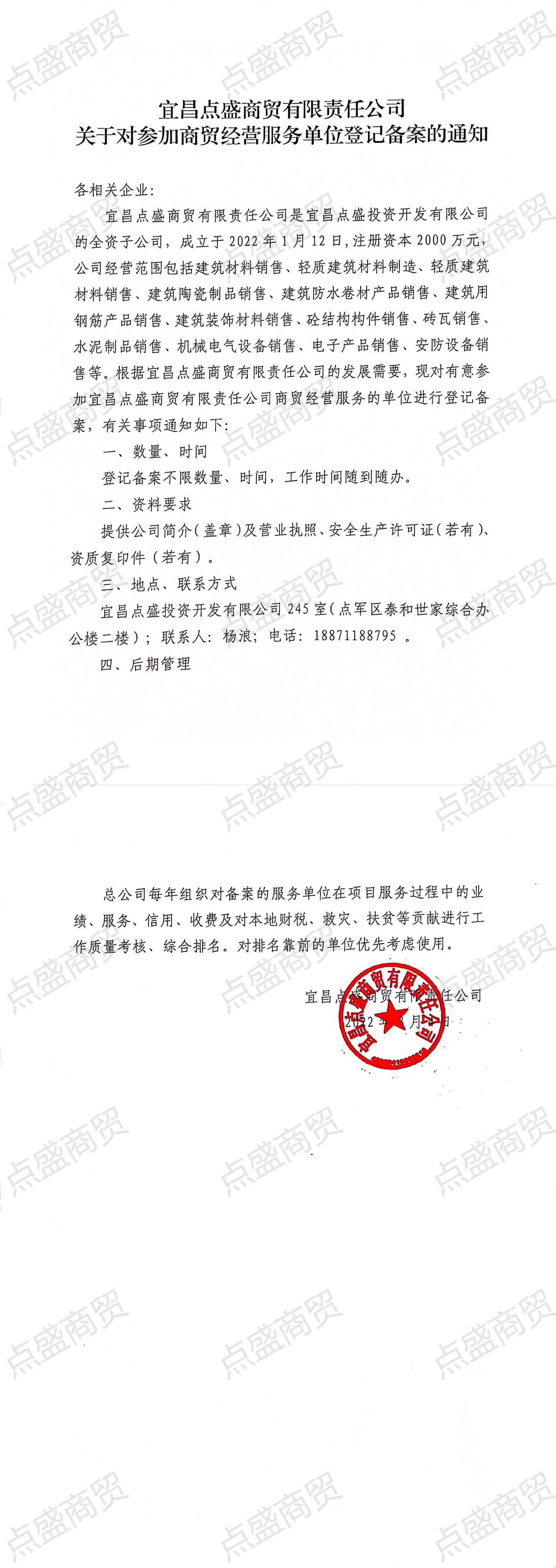 宜昌點盛商貿(mào)有限責任公司關(guān)于對參加商貿(mào)經(jīng)營服務(wù)單位登記備案的通知
