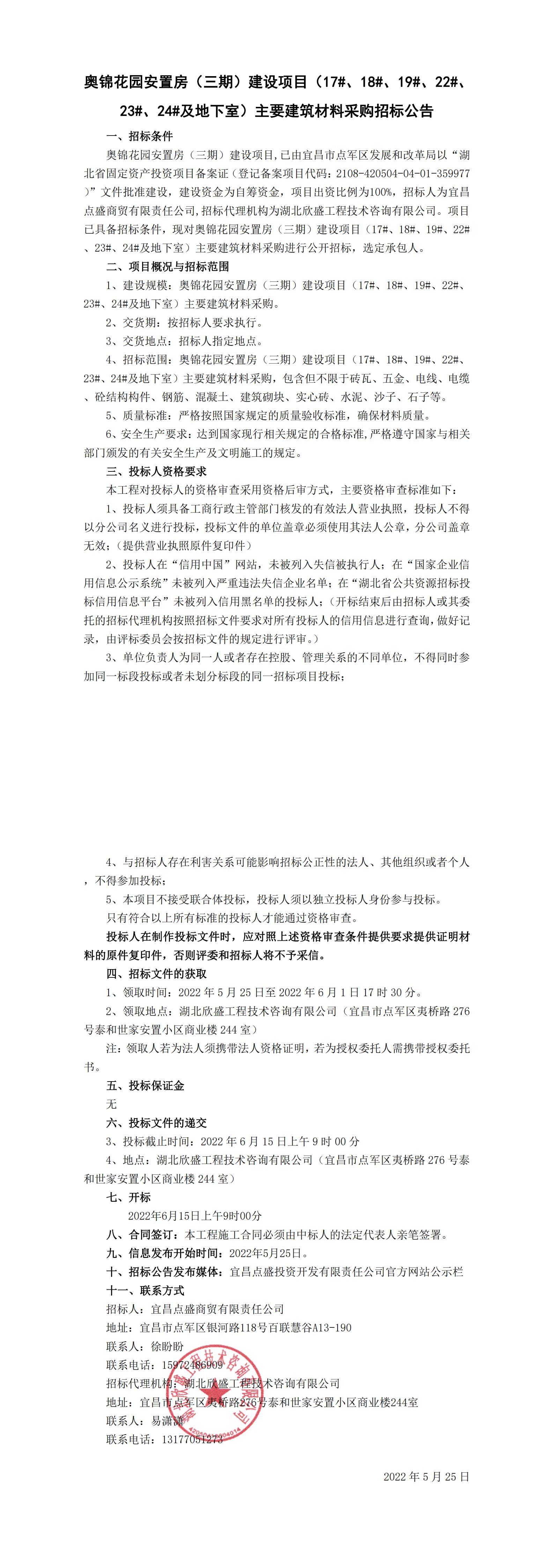 宜昌點(diǎn)盛商貿(mào)有限責(zé)任公司關(guān)于對(duì)奧錦花園安置房(三期)建設(shè)項(xiàng)目(17#、18#、19#、22#、23#、24#及地下室)主要建筑材料的采購(gòu)公告