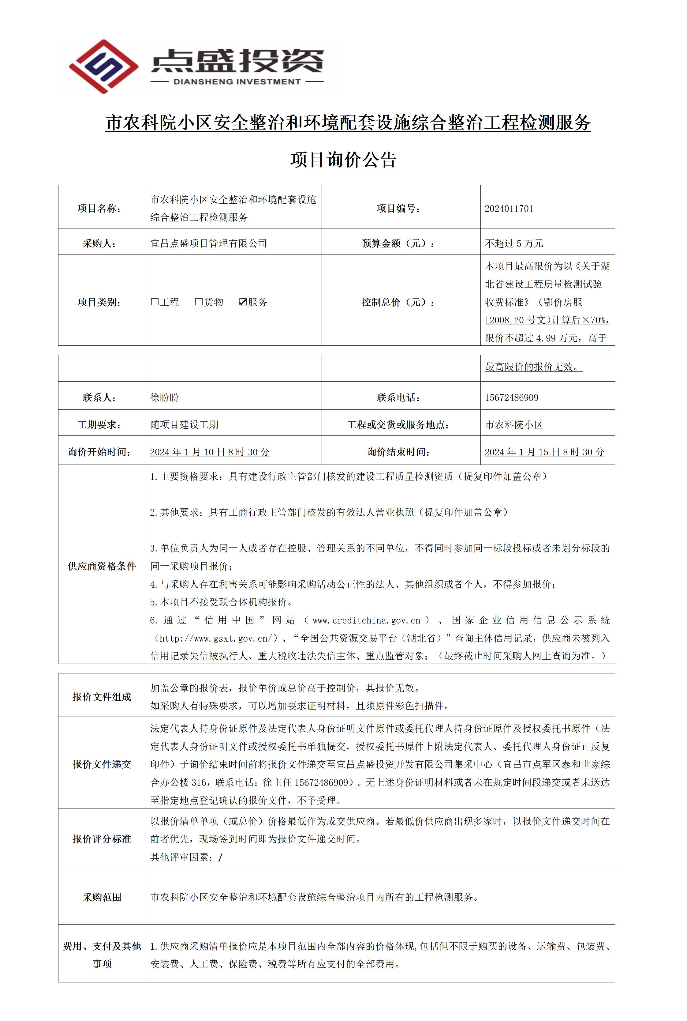 市農(nóng)科院小區(qū)安全整治和環(huán)境配套設(shè)施綜合整治工程檢測(cè)服務(wù) 項(xiàng)目詢價(jià)公告