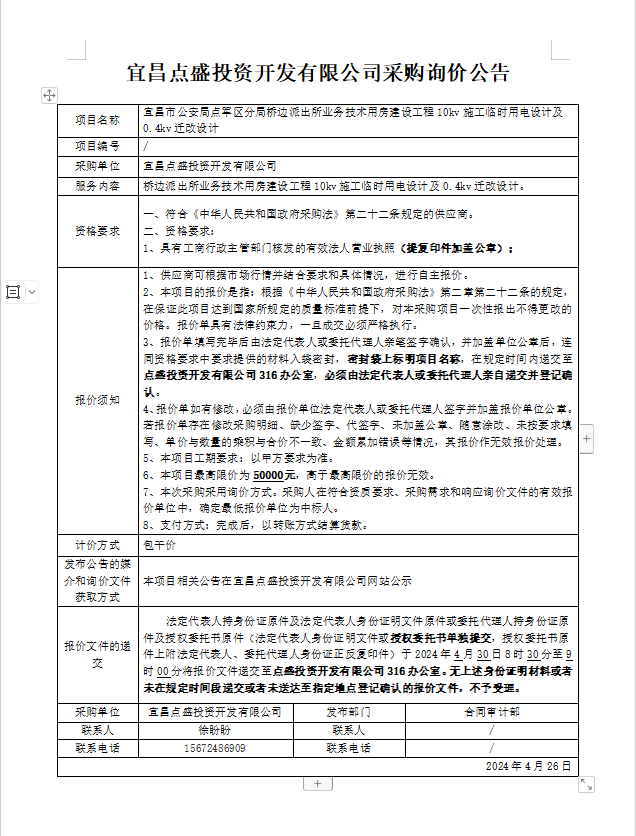 宜昌市公安局點(diǎn)軍區(qū)分局橋邊派出所業(yè)務(wù)技術(shù)用房建設(shè)工程10kv施工臨時(shí)用電設(shè)計(jì)及0.4kv遷改設(shè)計(jì)詢價(jià)公告