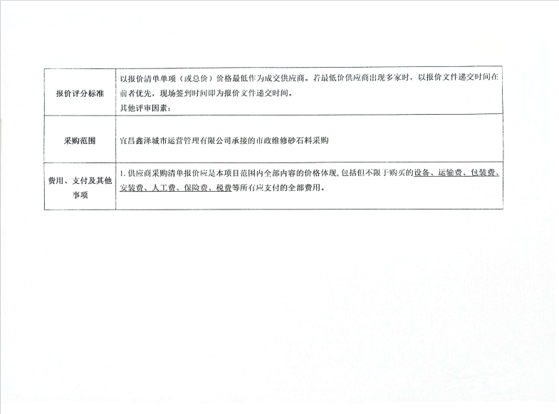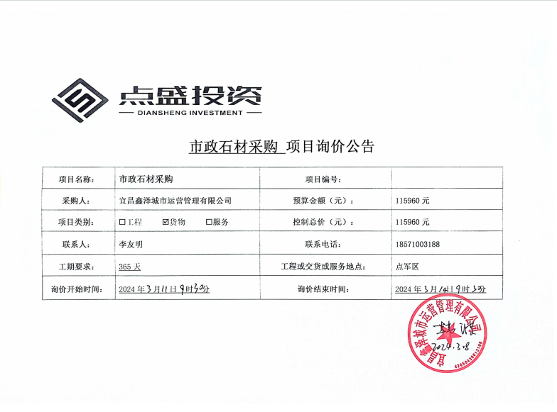 宜昌鑫澤城市運(yùn)營管理有限公司市政維修石材采購項(xiàng)目詢價公告
