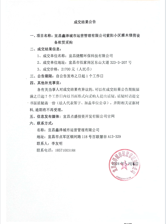宜昌鑫澤城市運(yùn)營(yíng)管理有限公司管紫陽(yáng)小區(qū)灌木修剪設(shè)備租賃采購(gòu)項(xiàng)目成交公告