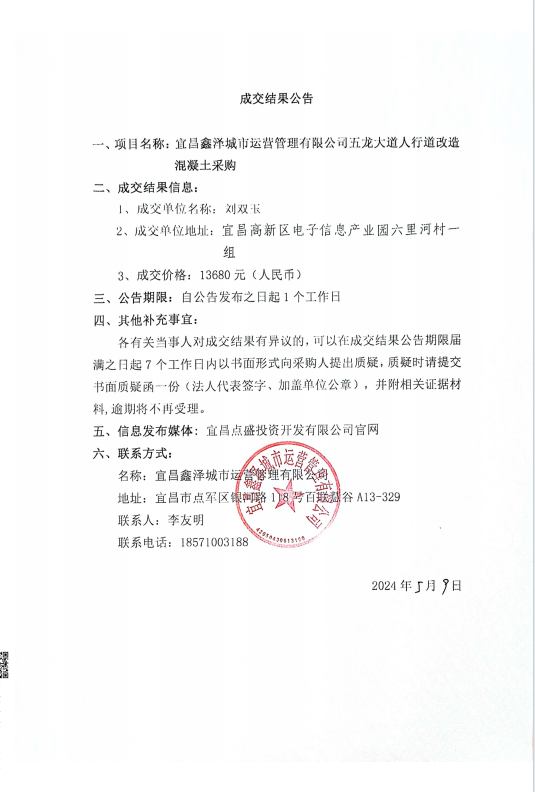 五龍大道人行道改造混凝土采購(gòu)項(xiàng)目成交公告