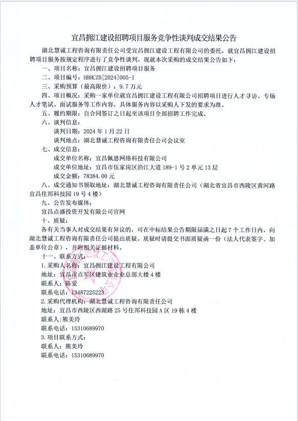宜昌擁江建設(shè)招聘項(xiàng)目服務(wù)競爭性談判成交結(jié)果公告