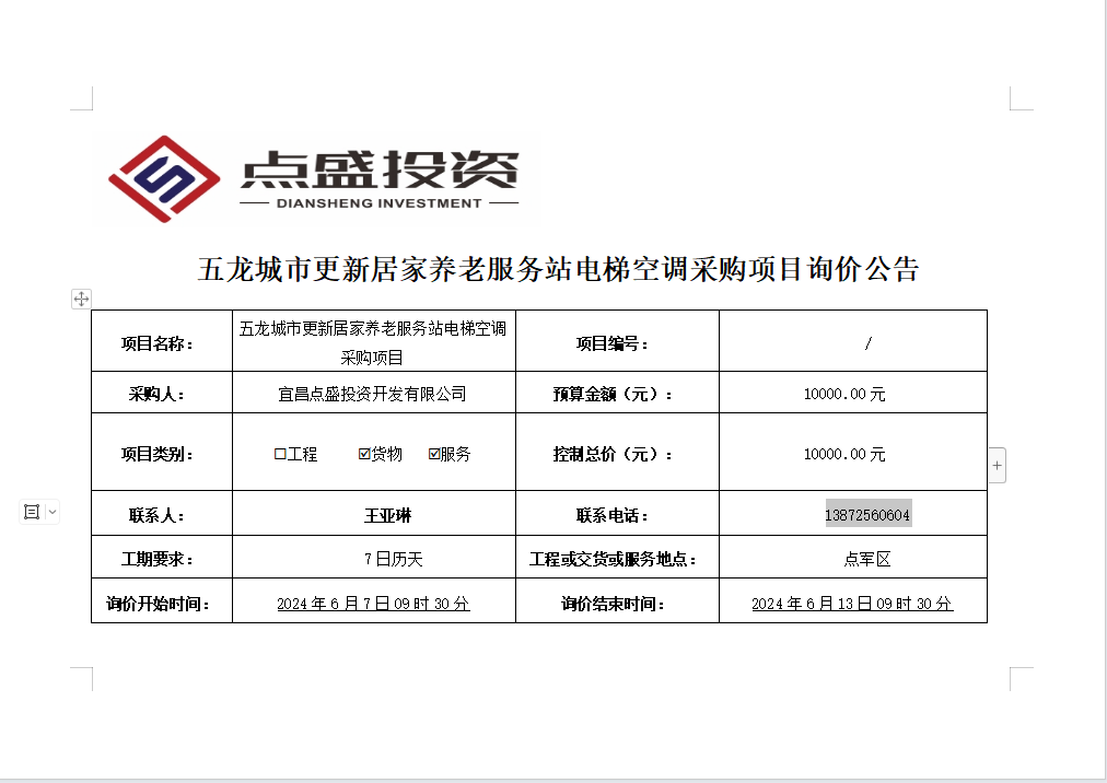 五龍城市更新居家養(yǎng)老服務(wù)站電梯空調(diào)采購項(xiàng)目詢價公告