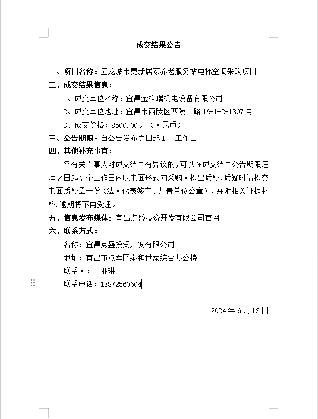 五龍城市更新居家養(yǎng)老服務站電梯空調采購項目成交公告