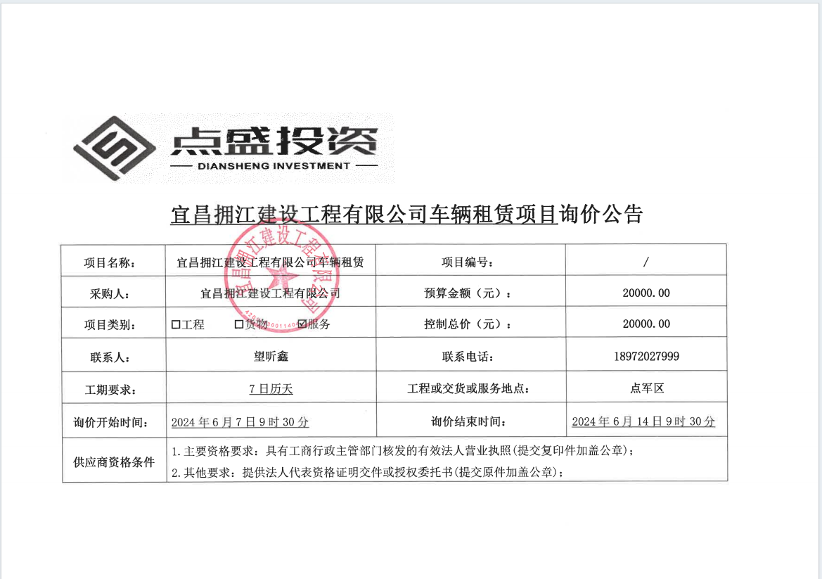 宜昌擁江建設(shè)工程有限公司車輛租賃項目詢價公告