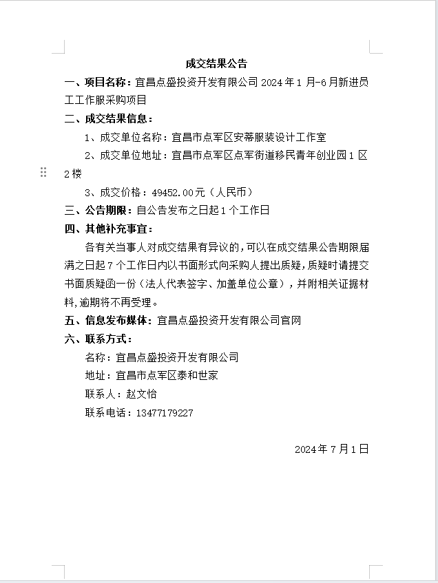 宜昌點盛投資開發(fā)有限公司2024年1月-6月新進員工工作服采購項目成交公告