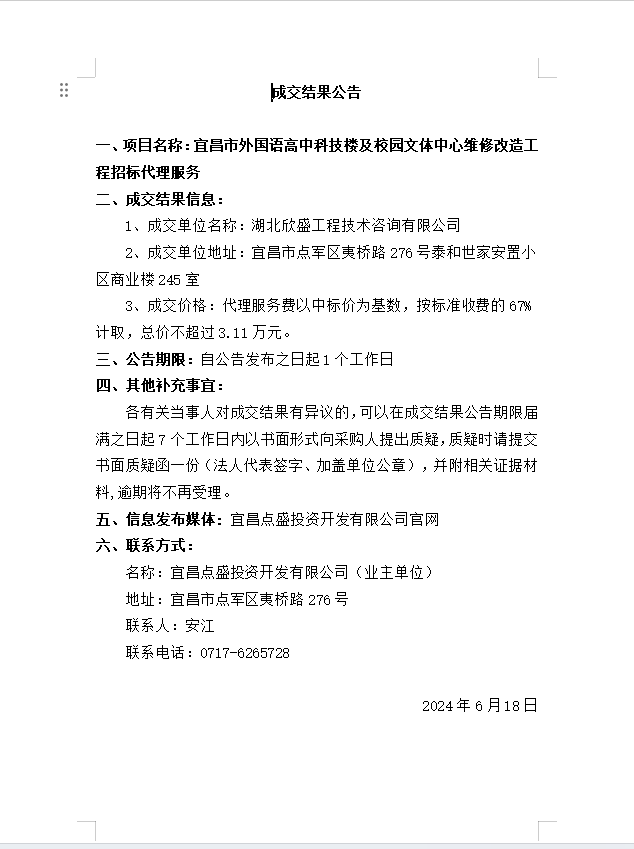 宜昌市外國語高中科技樓及校園文體中心維修改造工程招標(biāo)代理成交公告