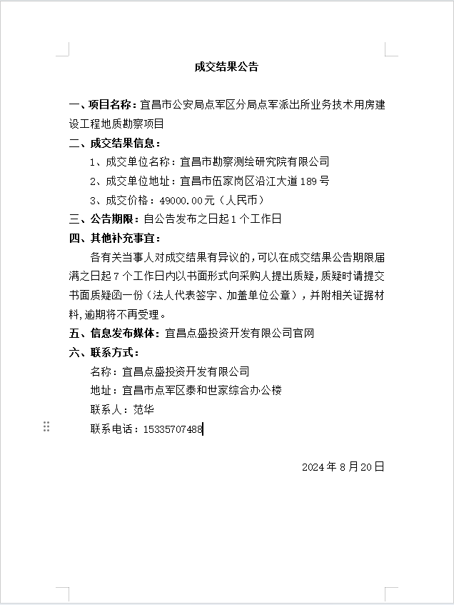 宜昌市公安局點(diǎn)軍區(qū)分局點(diǎn)軍派出所業(yè)務(wù)技術(shù)用房建設(shè)工程地質(zhì)勘察項(xiàng)目成交公告