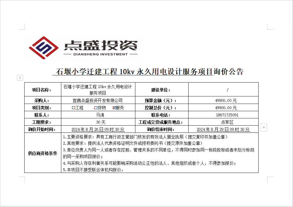 石堰小學(xué)遷建工程10kv永久用電設(shè)計服務(wù)項目詢價公告
