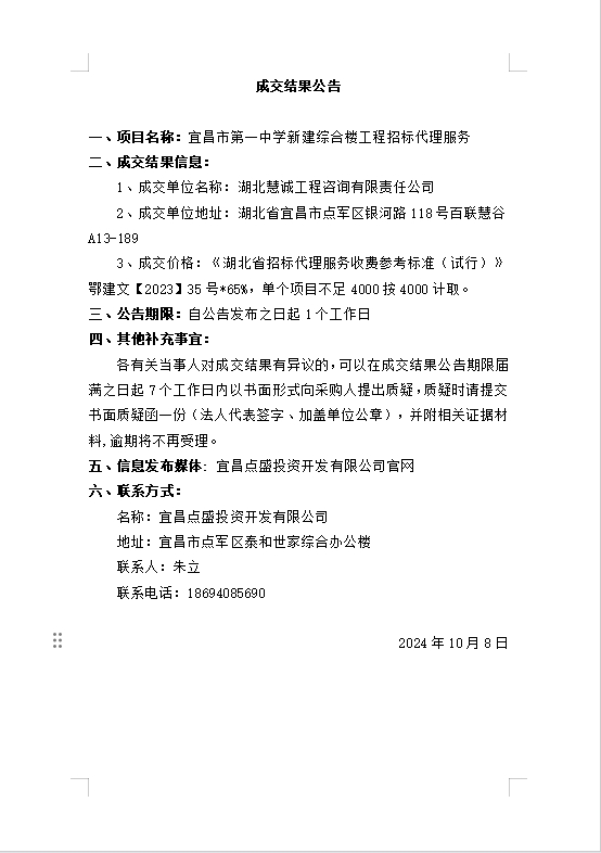 宜昌市第一中學新建綜合樓工程招標代理服務成交公告