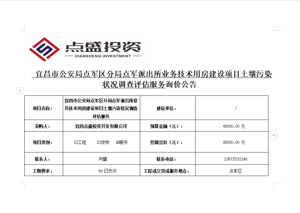 宜昌市公安局點軍區(qū)分局點軍派出所業(yè)務技術(shù)用房建設(shè)項目土壤污染狀況調(diào)查評估服務詢價公告