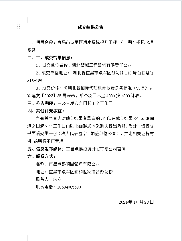 宜昌市點(diǎn)軍區(qū)污水系統(tǒng)提升工程 (一期)招標(biāo)代理服務(wù)成交公告