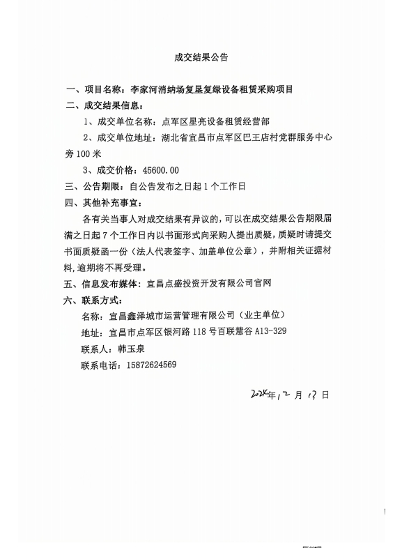 李家河銷鈉場復(fù)墾復(fù)綠設(shè)備租賃采購項(xiàng)目成交公告