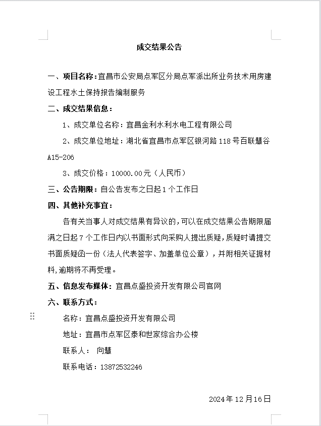 宜昌市公安局點軍區(qū)分局點軍派出所業(yè)務技術用房建設工程水土保持報告編制服務成交公告