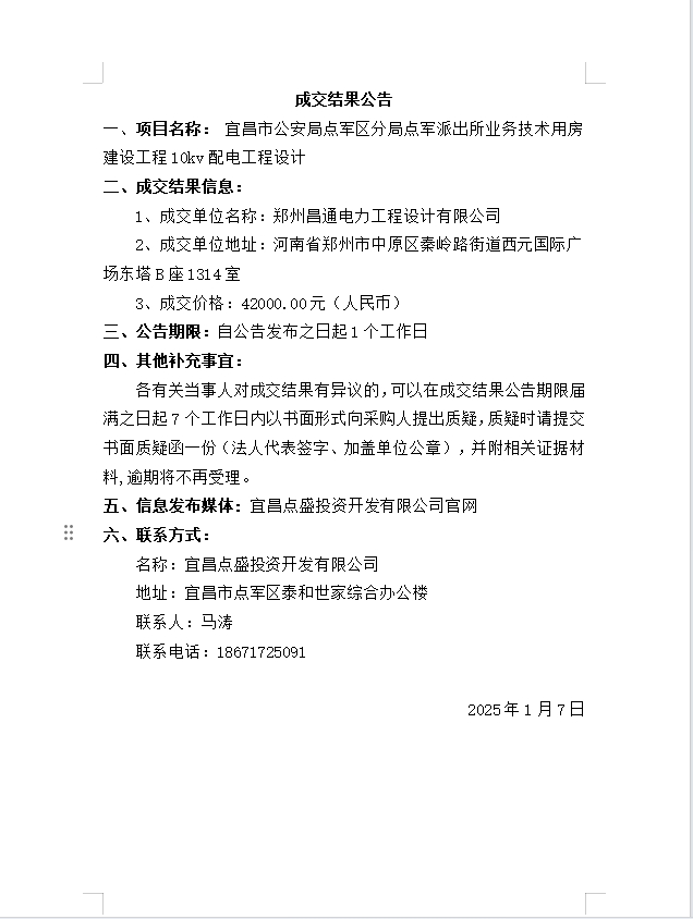 宜昌市公安局點(diǎn)軍區(qū)分局點(diǎn)軍派出所業(yè)務(wù)技術(shù)用房建設(shè)工程10kv配電工程設(shè)計成交公告
